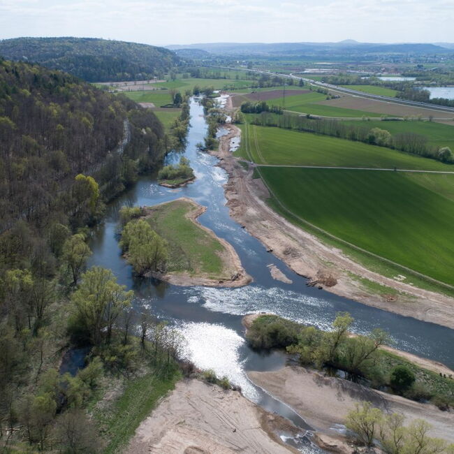 Ein umfangreiches Renaturierungsgroßprojekt wurde 2019/2020 an der „Gisselberger Spannweite“ südlich von Marburg im Rahmen des EU-Life-Projektes „Living Lahn“ umgesetzt. Der Klimaschutzplan Hessen leistete in diesem Projekt einen wesentlichen Teilbetrag. Durch die Renaturierung des Gewässer- und Auenbereiches auf einer Länge von rund 1,5 Kilometern wurden natürliche Lebensräume wiederhergestellt. Vielfältig geschaffene Strukturen wie Verzweigungen, Aufweitungen, die Anlage von Tümpeln, Inseln und Kiesflächen, der Verbau von Totholz und die Abflachung von Ufern können nun von diversen seltenen Amphibien, Vögeln und Fledermäusen als Lebensraum genutzt werden. Beispielhaft sind hier die Klimaverliererarten Kreuzkröte, Flussregenpfeifer, Eisvogel, Kiebitz und Bekassine zu nennen, die von der Maßnahme profitieren. Außerdem dient das Projekt als Trittstein im Biotopverbund der wassergebundenen Arten und vernetzt nah liegende Schutzgebiete miteinander. (Foto ©RP Gießen)